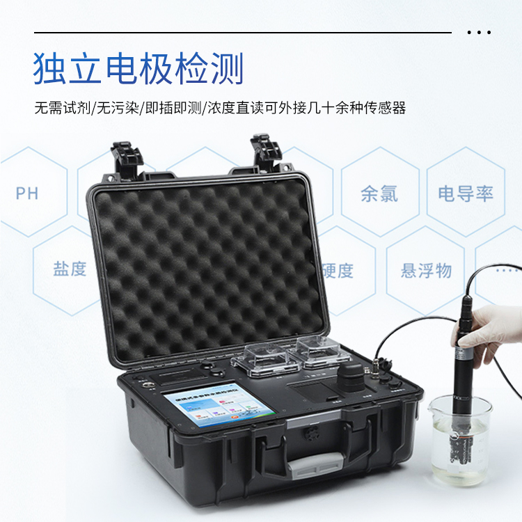 便携多参数水质检测仪一台仪器集成两种快速检测原理方法(分光法和电极法),采用高强度PVC工程塑料手提箱设计,消解检测一体式设计,其中消解模块具备双温区功能,检测部分同时具备360°旋转比色管检测和比色皿检测,安卓智能操作系统,8英寸高清液晶触摸屏,光纤检测技术,进口光源,内置大容量锂电池,便携多参数水质检测仪具有性能稳定、测量准确、测定范围广、功能强大、操作简单等特点。